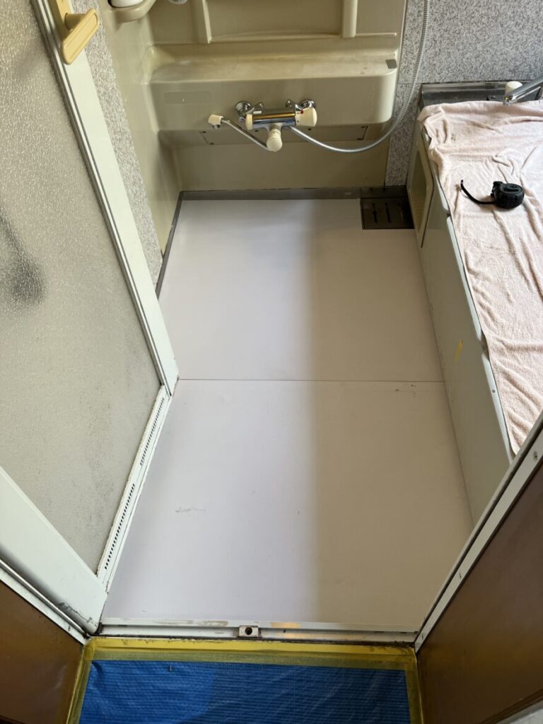 タイル下のステンレス部分に下地処理を加え、塩ビパネルを取付。その上からビニールシートを重ね貼り、端部をコーキング処理して完成となります。