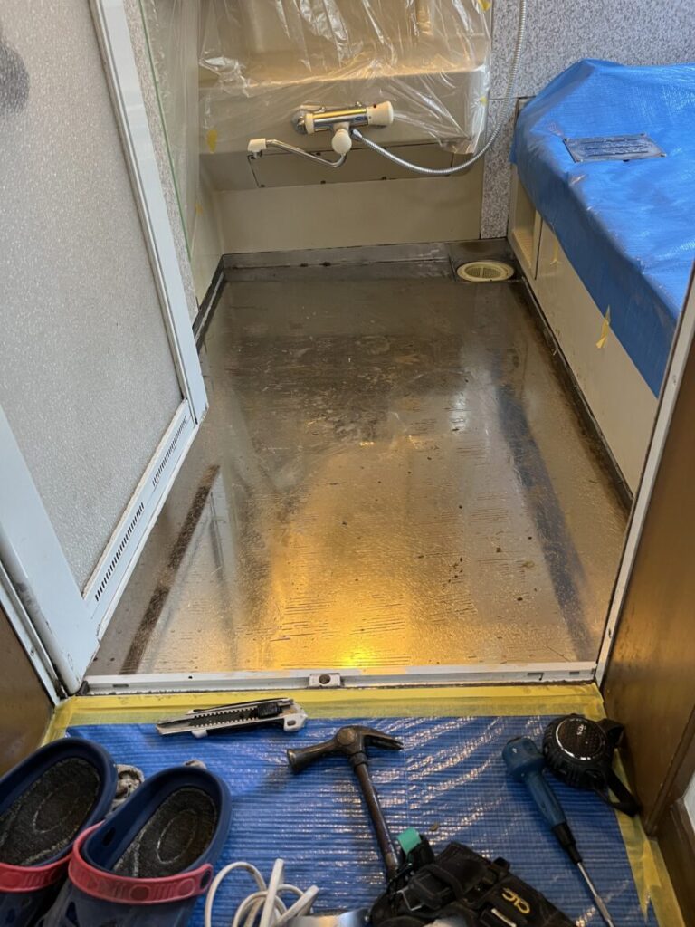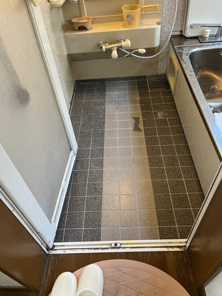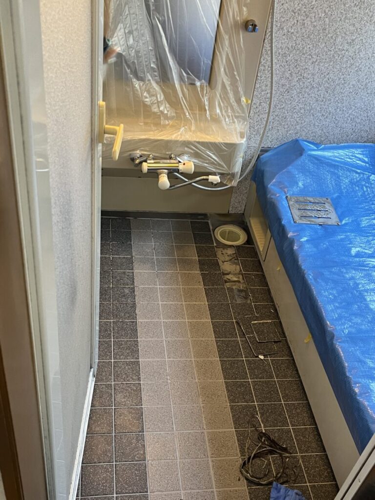 ところが浴槽他養生をしたうえ周囲のタイルの状況を確認し始めたところ、想像以上にタイルの浮きが広範囲に見受けられ、結果床タイルを全部撤去することになりました。